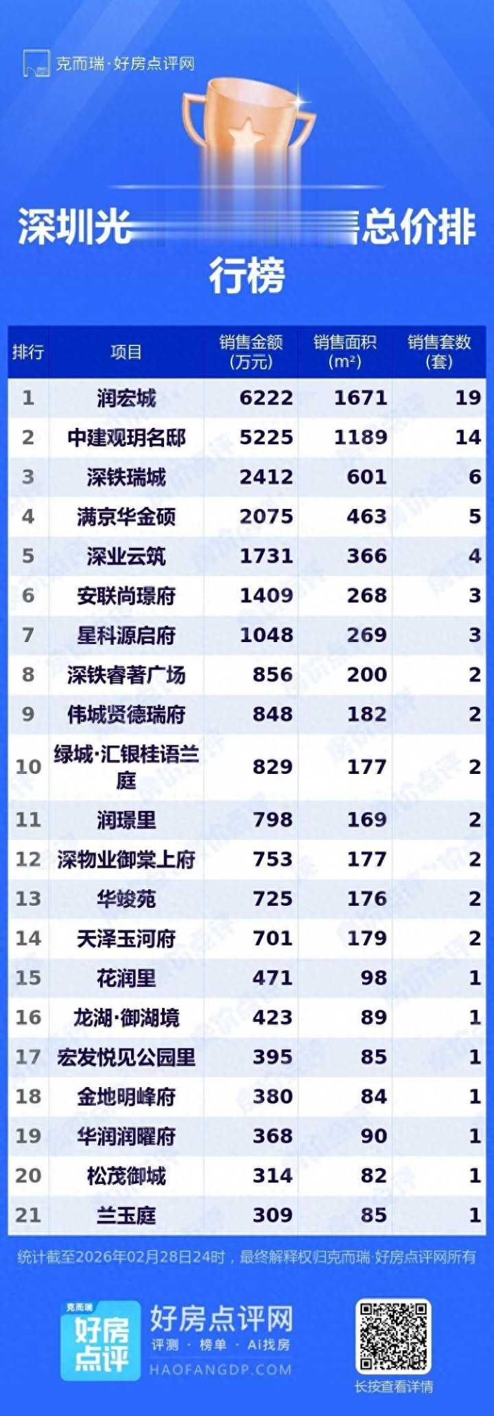 2026 年 2 月深圳光明区房地产销售金额榜单新鲜出炉。